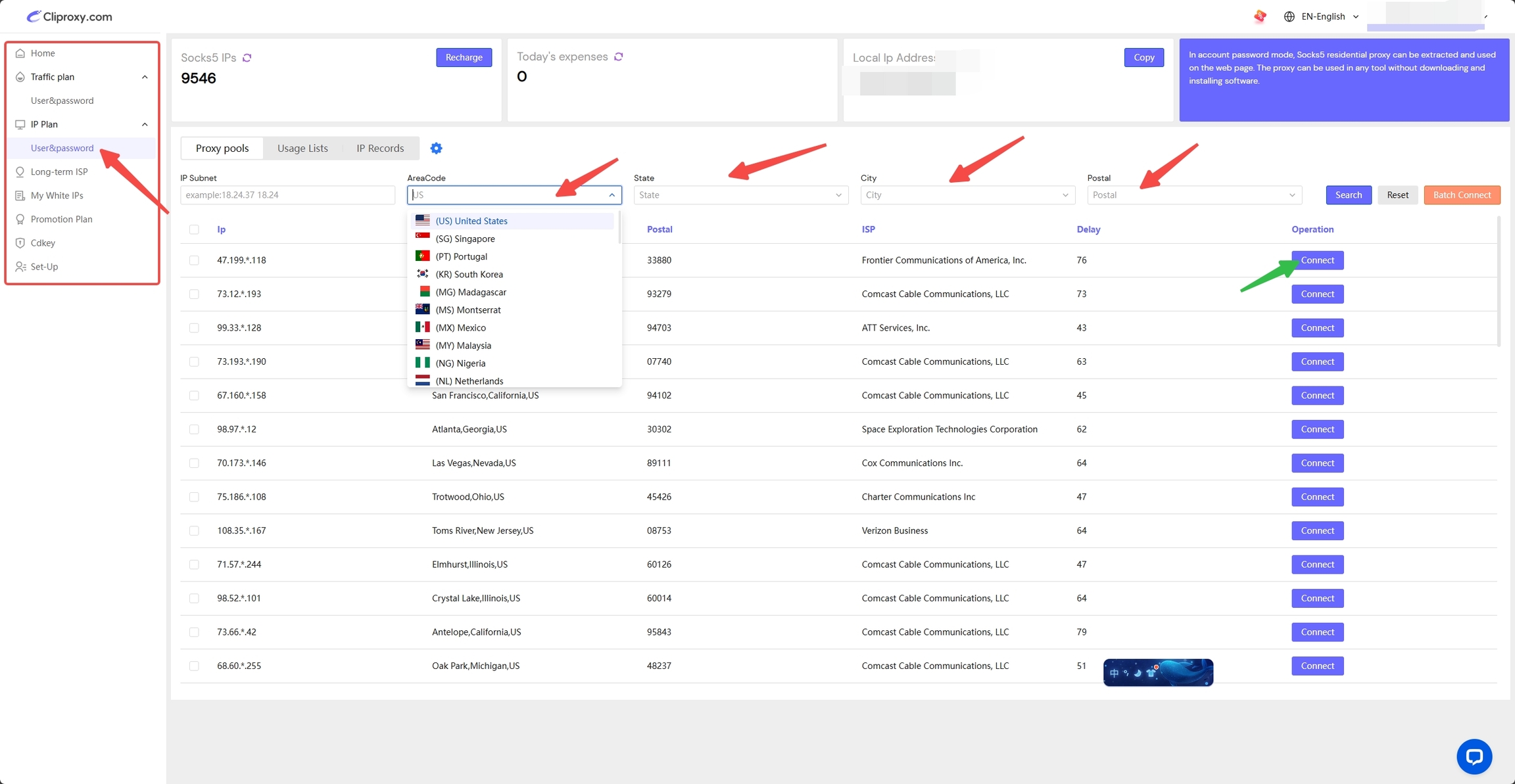 2、Please select the IP type you want to extract on the left (here we take Socks5 as an example). Then select your target country, region and street information in [Proxy pools], click [Search] to get your target IP list, and finally select a suitable IP and click [Connect].