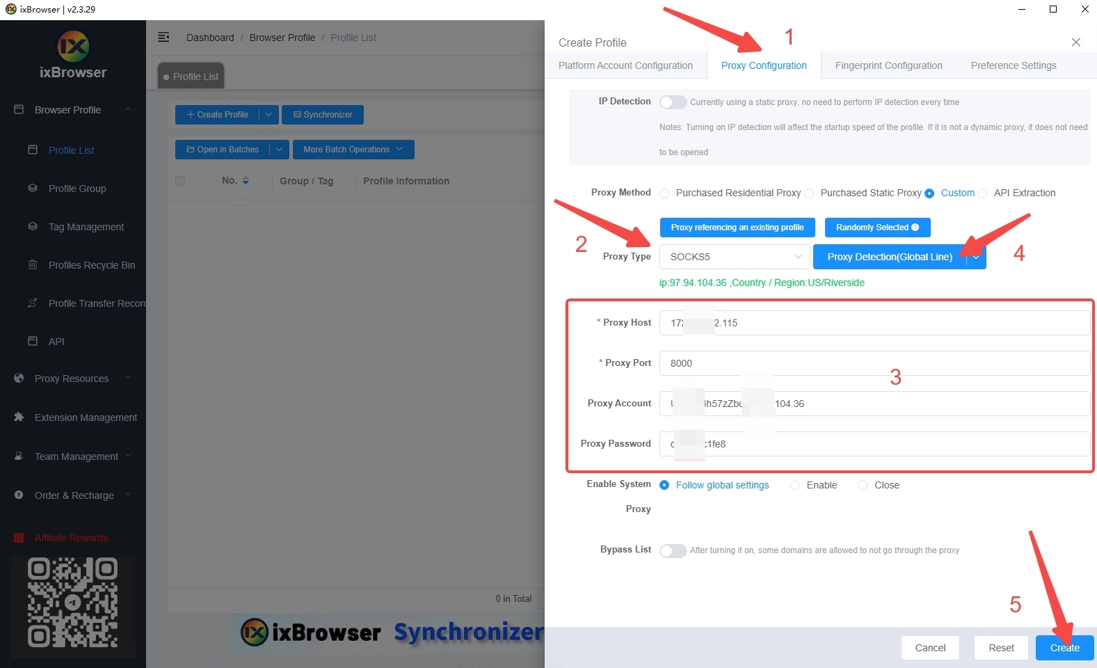 5、Enter the proxy settings, select the proxy type as Socks5, and paste the IP data you copied into [Proxy Host]. ixBrowser will automatically divide the columns and place your IP data in the corresponding positions. Click [Proxy Detection] to check whether your IP information is true and reliable (green IP information means no problem). Finally, click [Create] in the lower right corner.