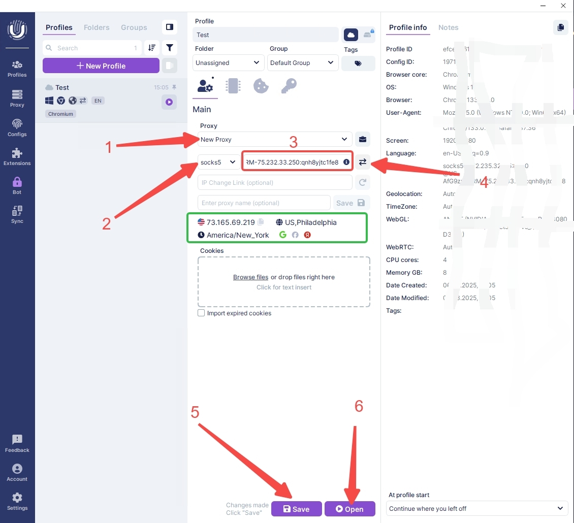 1. Next, you need to add the proxy information of Cliproxy. Select [New Proxy] in [Proxy], select [SOCKS5] proxy type below, and paste the proxy information copied from Cliproxy backend directly into the input box on the right; finally, click the [Detection Symbol] on the right, and you can see the location information of the IP appears below, indicating that the IP is normally configurable.